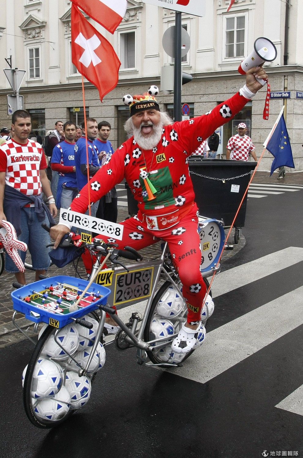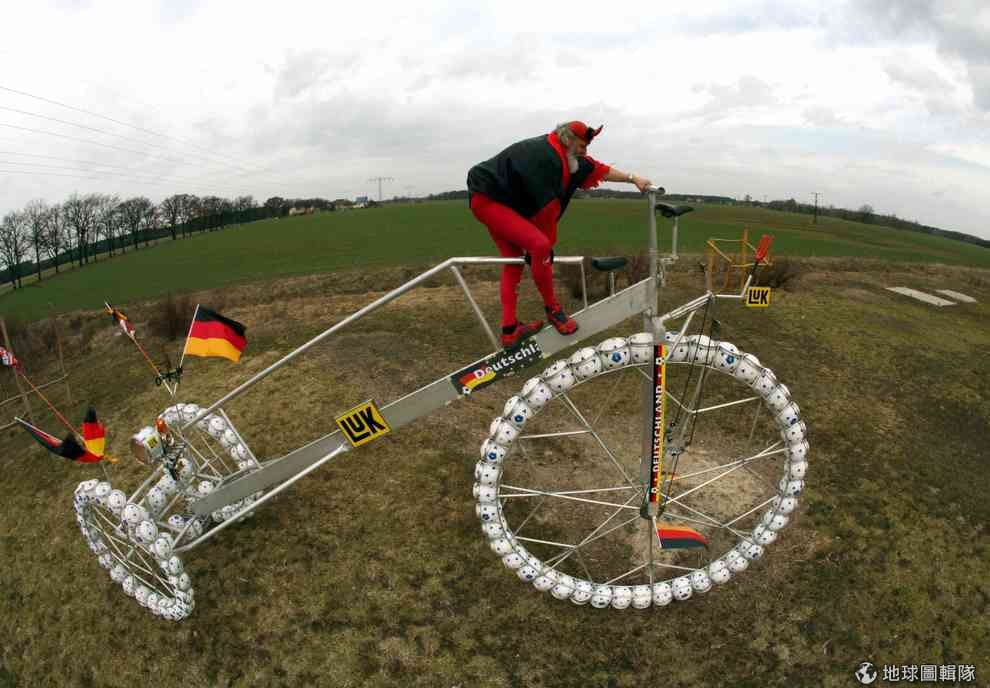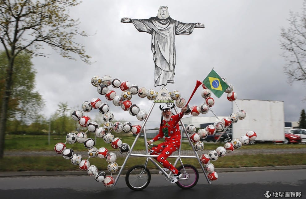 你要怎麼表達對2014世足賽的支持?已經62歲的「迪迪‧森夫特」(Didi Senft)會跟你說「那就做輛車吧!」,照片中的迪迪為了支持今年的世界杯足球賽,特地打造一輛掛滿72顆足球、排成巴西字樣的腳踏車來秀出他的狂熱。他還加上了巴西知名的基督像在上面。