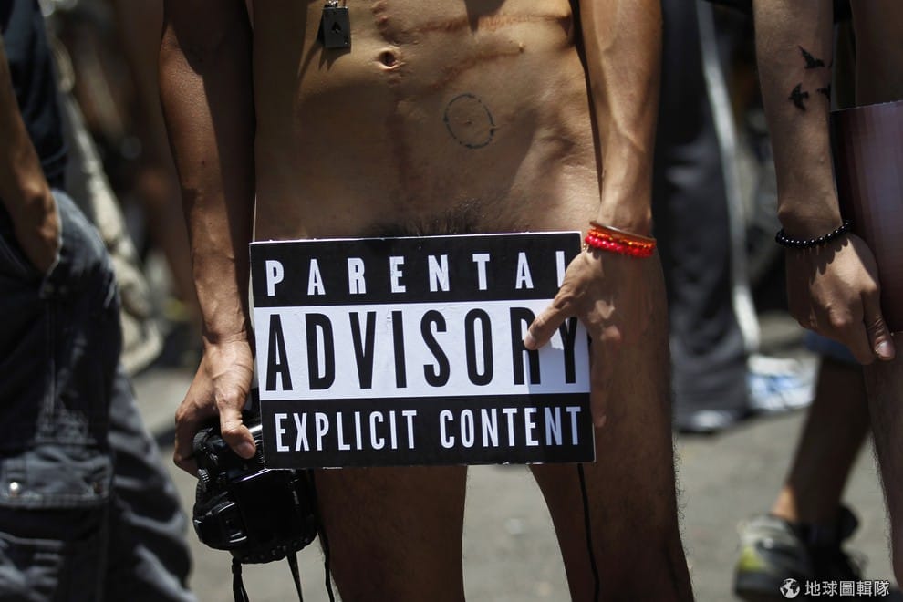 路透社2013年時,有單車客拿著標語寫著「建議父母陪同觀賞」。