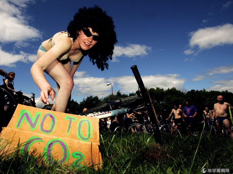 路透社上圖是 2005年的裸體單車活動,當年民眾多是要替全球暖化發聲。不論議題為何,也有不少民眾是趁著這裸體活動的機會享受自由解放或是聲張自我的快樂,他們用水彩、裝飾品變裝,讓世界看到不一樣卻真實的自己。