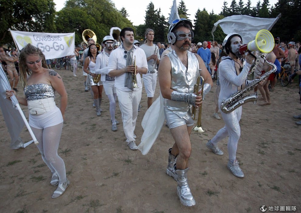 路透社波特蘭市的民眾在2014年6月8日時先舉辦樂隊遊行,替 14號要開始的第11屆裸體自行車活動暖身。