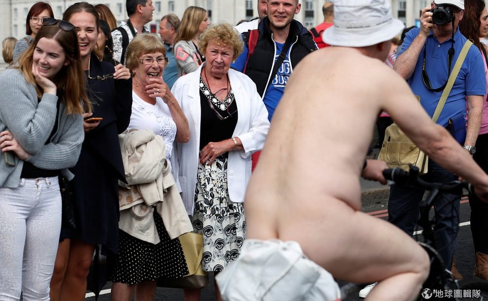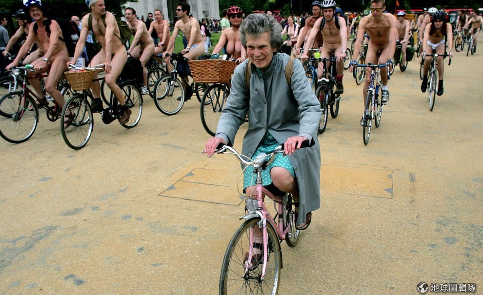 路透社裸體單車日活動行之有年,每年都有讓人看了會心一笑的畫面,例如老太太與身後一整片的裸體單車客形成強烈對比。