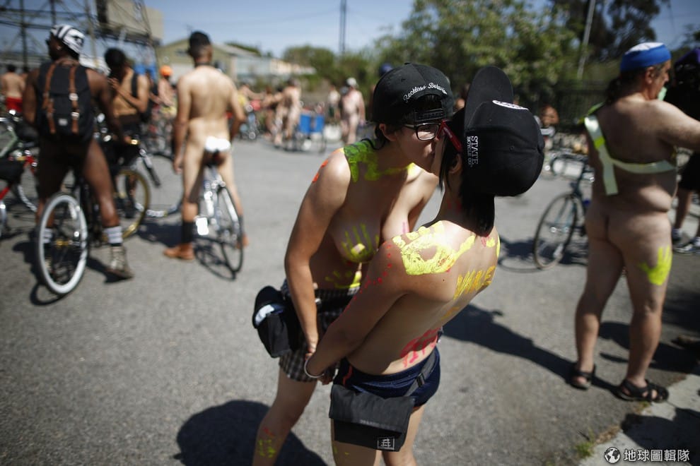 路透社19歲的情侶開心地親吻準備參加2014年的裸體自行車活動。