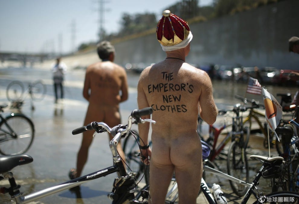 2014年時,54歲的克蘭恩(Dennis Crane)背上寫著「國王的新衣」,他正準備參加洛杉磯當地舉辦的「世界裸體自行車」活動。