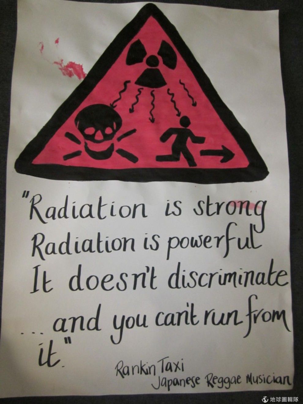 活動海報上寫著「輻射是很強的存在,輻射的影響力很大,它不會歧視任何人,所以你也躲不過它」。Photo credit: davidfntau