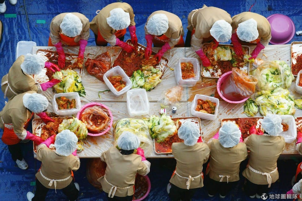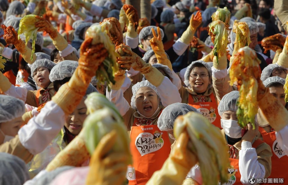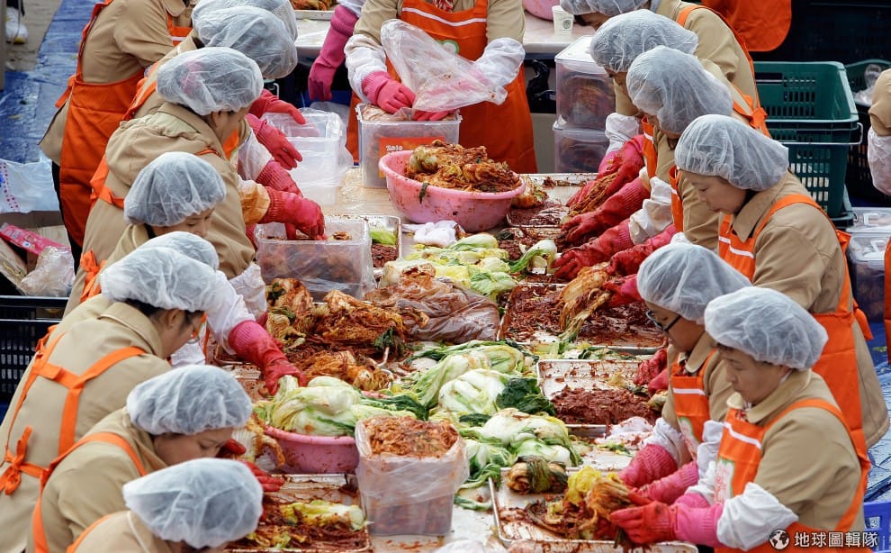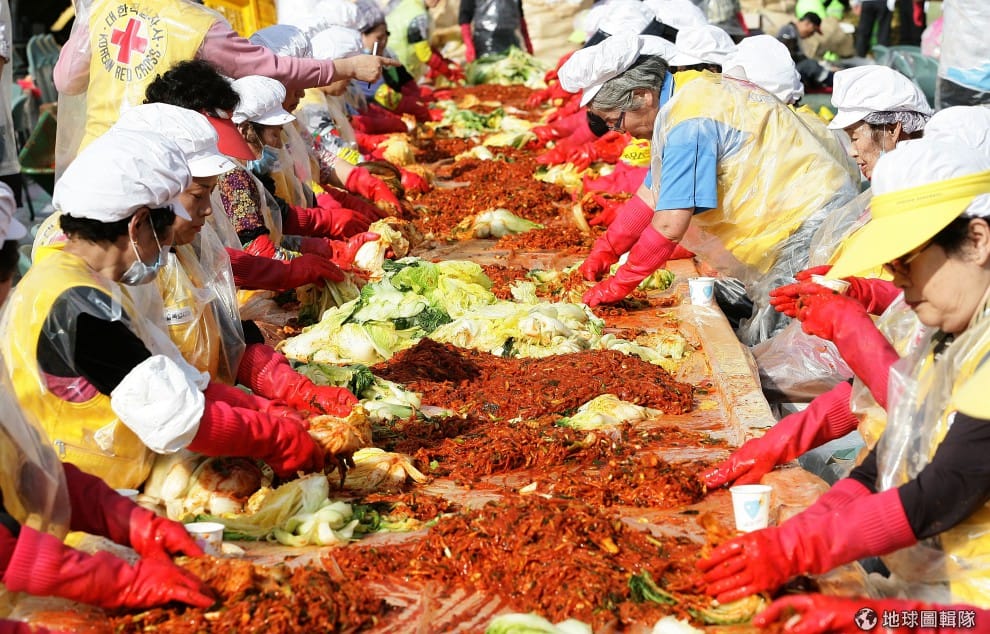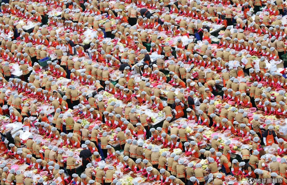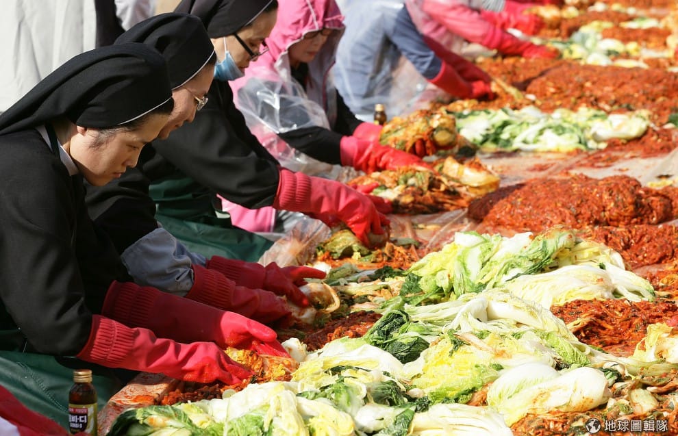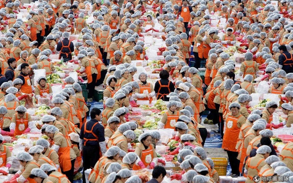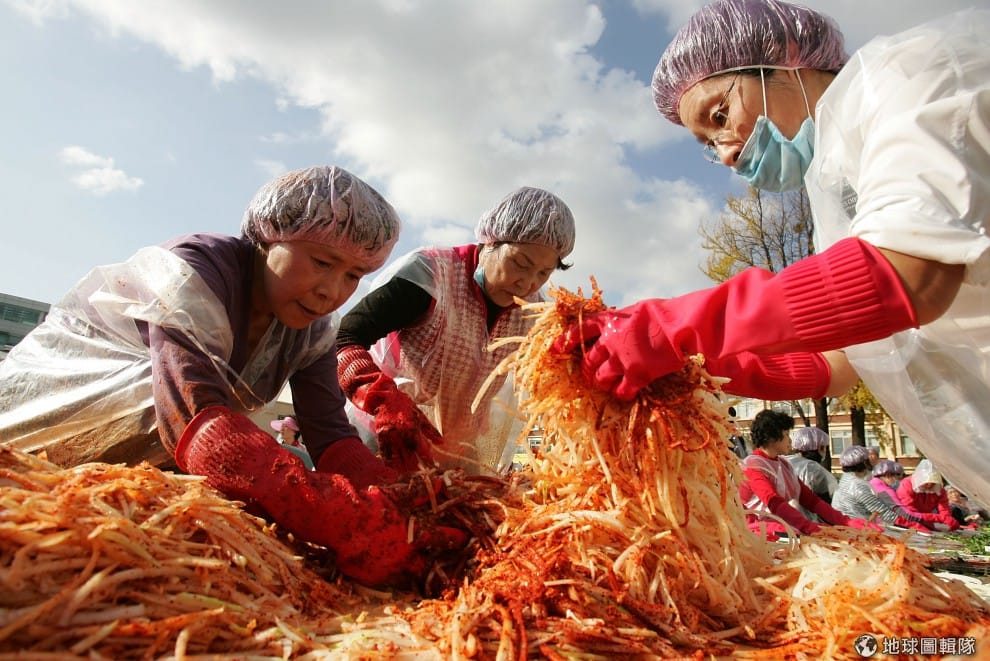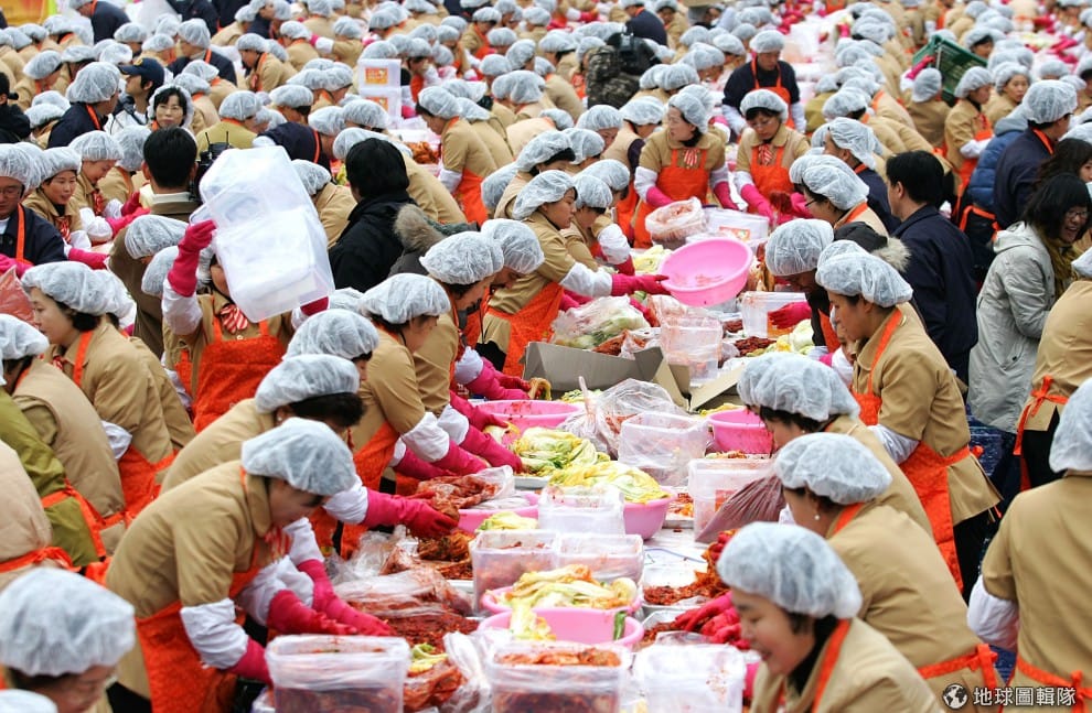 gettyimages全穿上一樣服裝、戴上帽子、塑膠手套的媽媽們,一起陷入紅通通的泡菜大海中。圖片來源:Chung Sung Jun/Getty Images