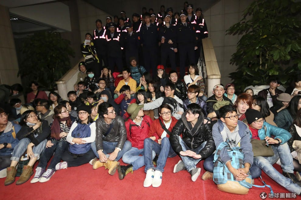 2014年3月下旬太陽花學運震盪全台,照片中的學生們在行政院內靜坐。