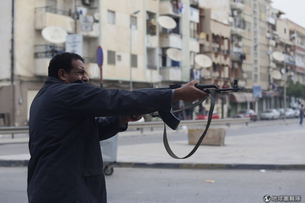 支持利比亞軍隊的民眾對著伊斯蘭教法虔信者組織成員開槍。