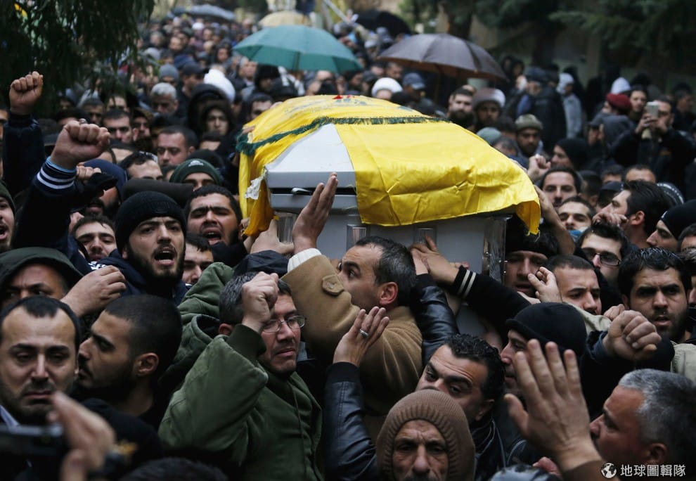 真主黨的成員們高舉雙手檯著他們軍官將領的棺木。這位真主黨軍官哈珊(Hassan al-Laqqis)在敘利亞內戰中遭槍擊身亡。