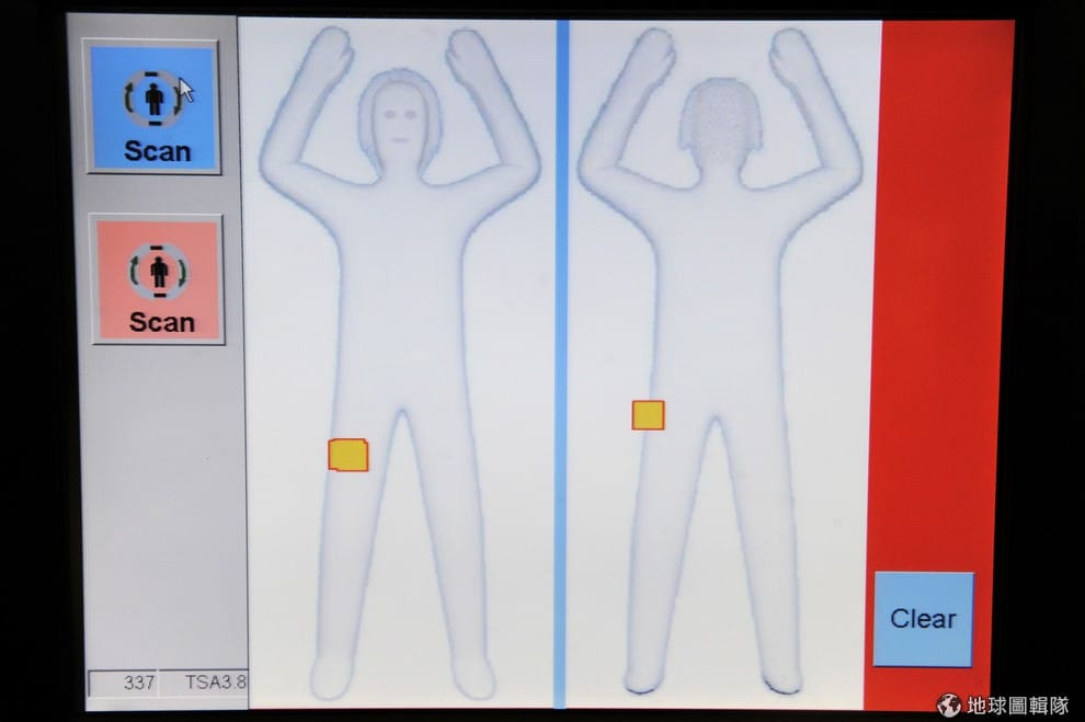 照片中是美國的安檢掃描畫面,美國運輸安全管理局(TSA)在2011年時改進掃描顯示畫面,只用簡單的線條顯示人體避免裸露爭議。