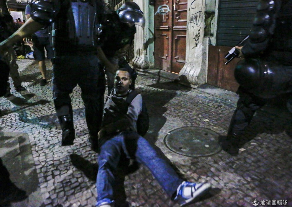 路透社巴西警察拖走為反世界盃上街的抗議民眾。