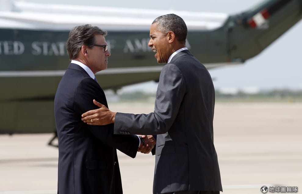 共和黨德州州長培里(Rick Perry)迎接9日到訪德州參加美墨邊界協商的歐巴馬總統。