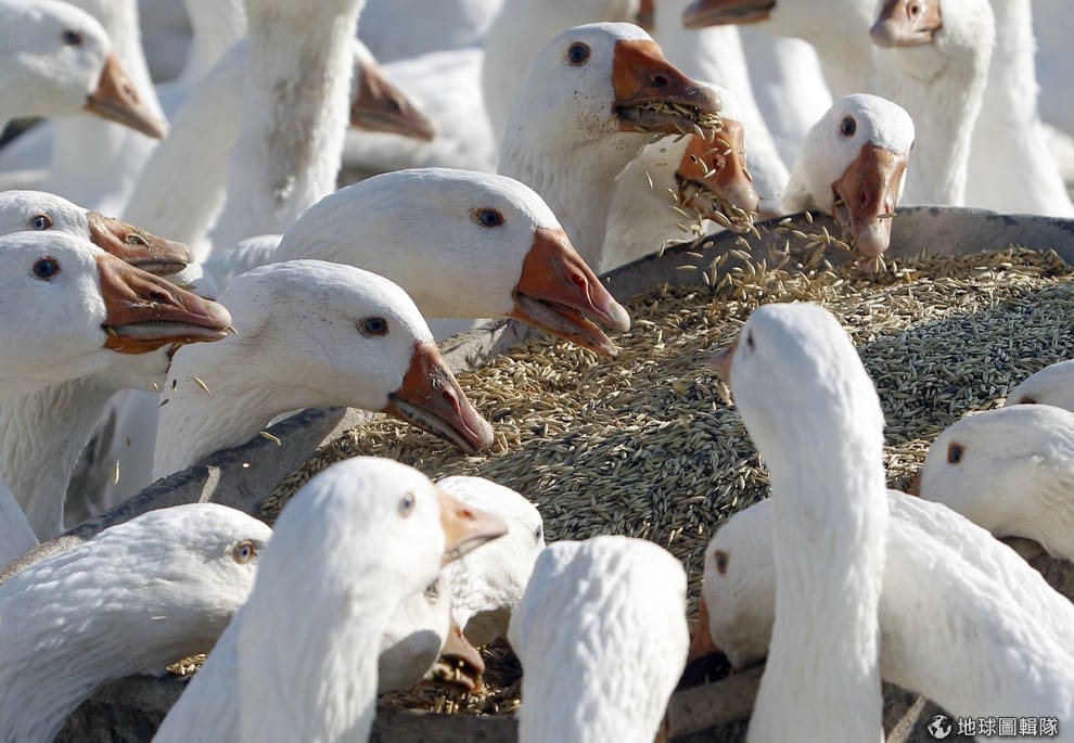 路透社奧地利一處農場中,白鵝們正擠在飼料桶旁一塊吃大麥。