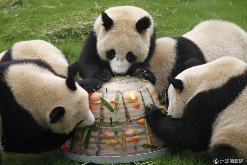 上海野生動物園內,大貓熊們正一起享用「水果冰大餐」。