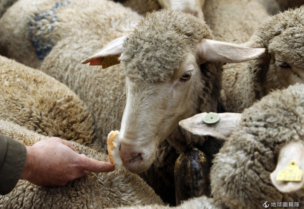 路透社西班牙馬德里當地,牧羊人正忙著把飼料餵給羊群吃。