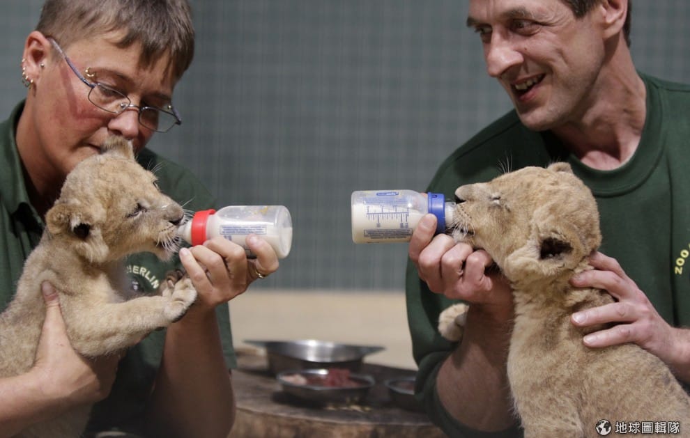 路透社德國的柏林動物園中,飼育員正忙著餵飽兩隻小獅子。