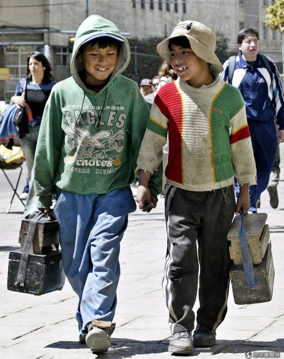 2個玻利維亞小朋友幫人擦完鞋子,手牽著手走在路上。
