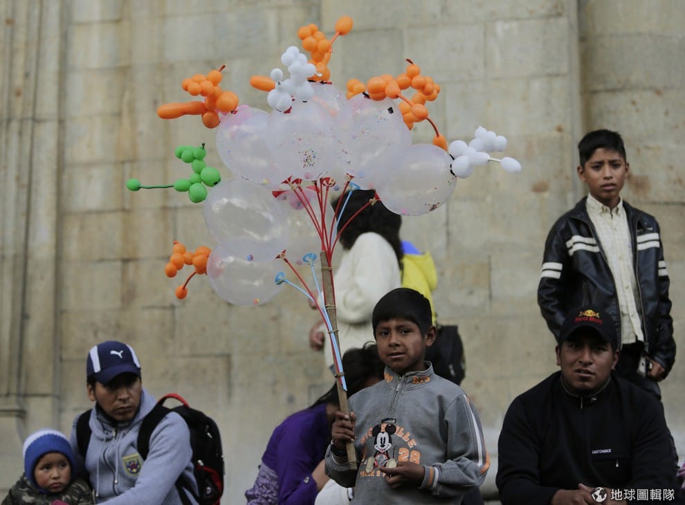 在玻利維亞,小朋友工作是件很常見的事,你可以看到他們在街上幫人擦鞋子或是在公車上收集車費。儘管在這幾年,玻利維亞的貧窮已經減輕了一些,還是有將近1百萬人一天只靠著75便士(折台幣3.8元)生活。