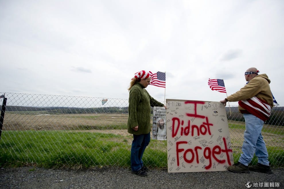gettyimages賓拉登死訊正式宣布後,一對夫妻手拿寫著「不曾忘卻」(I did not forget)的板子,正站在當年飛機失事地點之一的賓州地區。該區的紀念公園也正開始動工。圖片來源:2011/05/02;Jeff Swensen/Getty Images