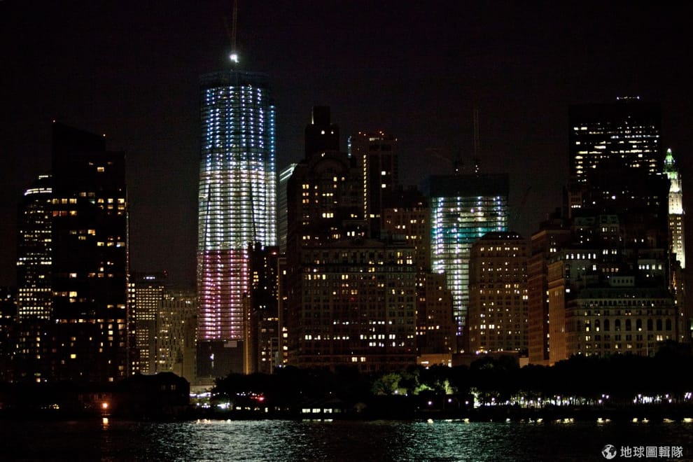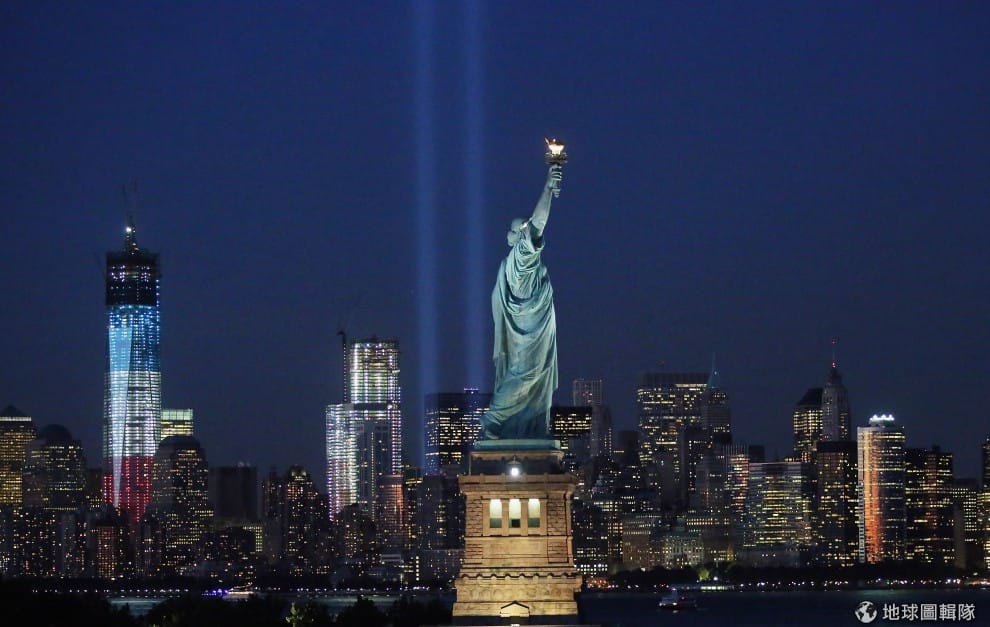 gettyimages911事件滿11週年的夜晚,自由女神像、悼念罹難者的光束(Tribute in Light)、以及正在興建的世貿中心1號樓,一同在夜色中放出光芒。圖片來源:2012/09/11;Mario Tama/Getty Images
