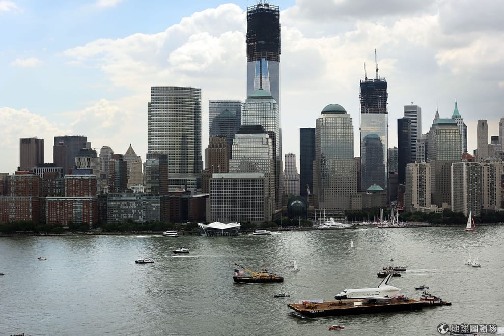 gettyimages白天的世貿中心1號樓,前面的哈德遜河(Hudson River)上面,恰好是資深的發現者太空梭,美國太空總署NASA正在讓退休的發現者號做最後一次的巡禮。圖片來源:2012/06/06;Spencer Platt/Getty Images