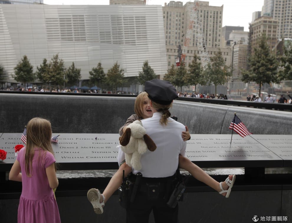 gettyimages一位女警官正抱著做鬼臉的小女生,他們正站在成為紀念公園的世貿雙子星遺址。圖片來源:2011/09/11;Lucas Jackson-Pool/Getty Images