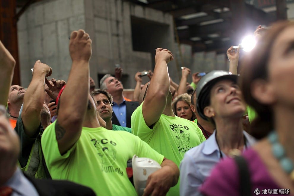 gettyimages建築工人開心的拍下世貿中心4號樓完工的一刻,4號樓預計在2013年正式對外開放。圖片來源:2012/06/25;Spencer Platt/Getty Images