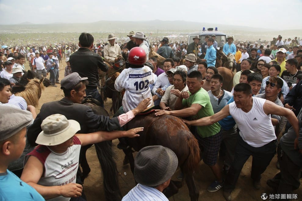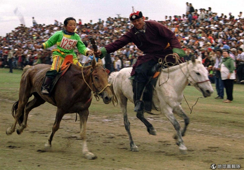 路透社比賽的裁判試著要拉住跑贏 28公里賽跑的冠軍馬,根據那達慕的傳統規定,只有 6-12歲的小孩才能參加賽馬比賽。
