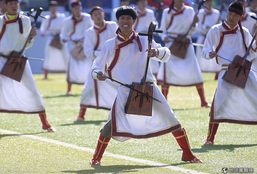 那達慕的開幕典禮上,參加人一起演奏蒙古的傳統樂器。