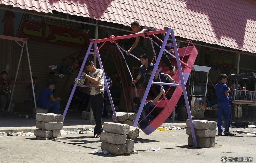 摩蘇爾城裡可以看到伊拉克小孩在玩著遊樂器材