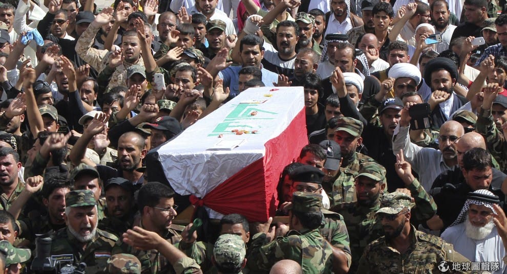人們抬著戰死士兵的棺木,棺木中士兵是什葉派信徒,他自願加入伊拉克政府軍卻在與ISIL組織的戰鬥中不幸身亡。