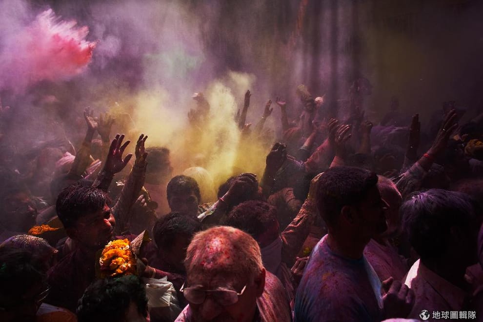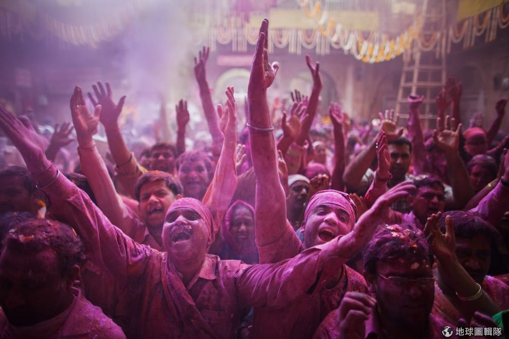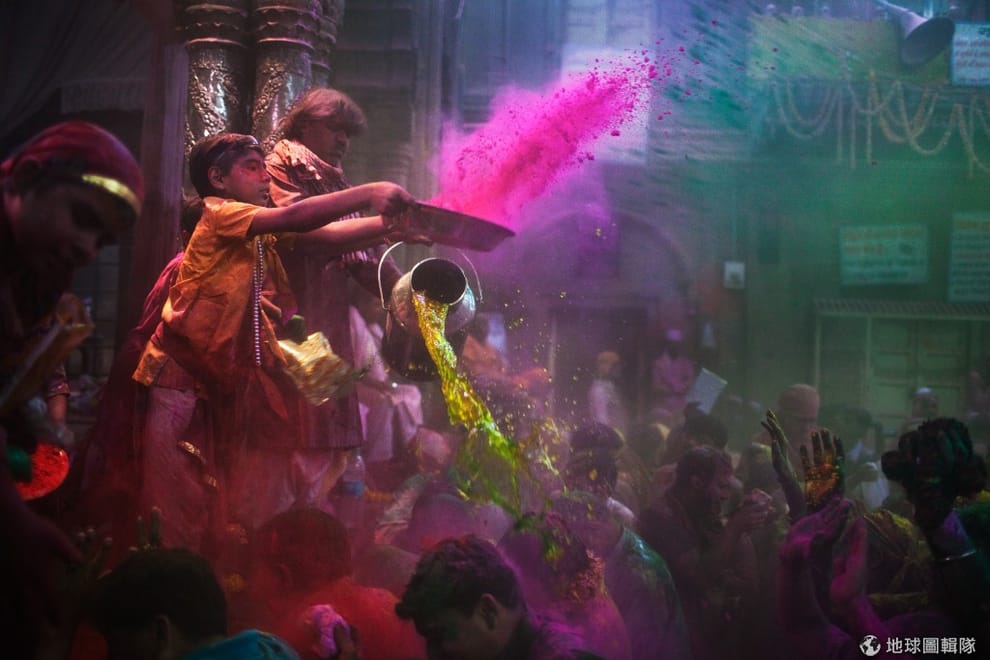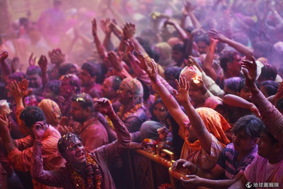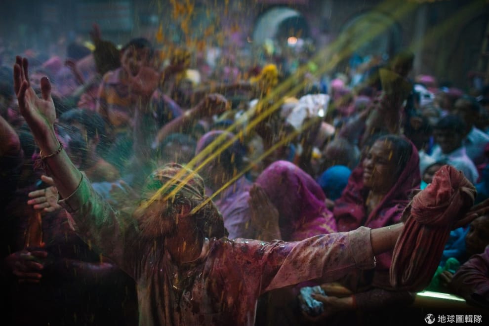 印度沃爾達文(Vrindavan)當地的班科-碧哈瑞廟(Bankey Bihari Temple),一群參與色彩節的信眾。Daniel Berehulak/Getty Images