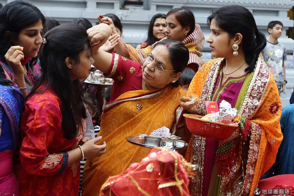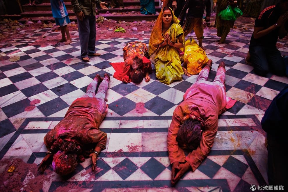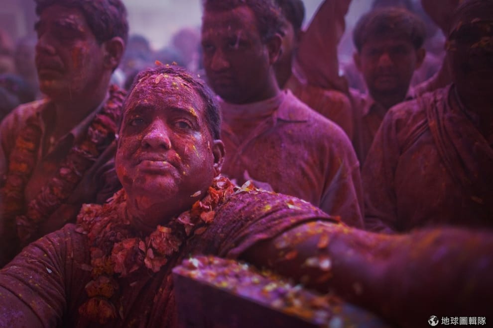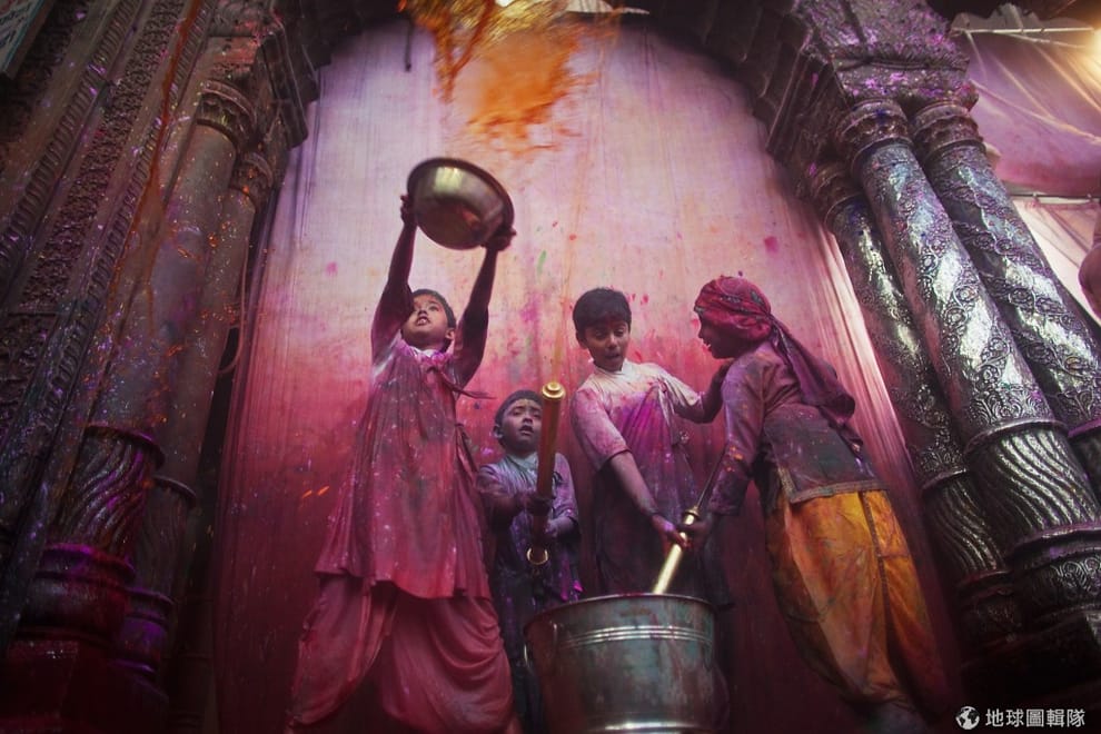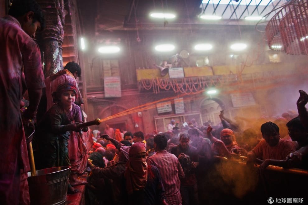 印度沃爾達文(Vrindavan)當地的班科-碧哈瑞廟(Bankey Bihari Temple),一群參與色彩節的信眾。Daniel Berehulak/Getty Images