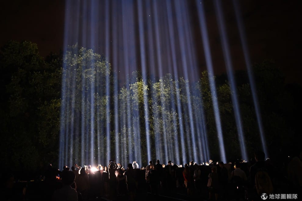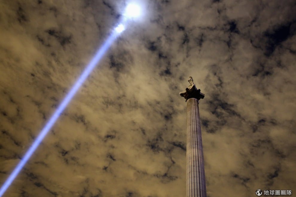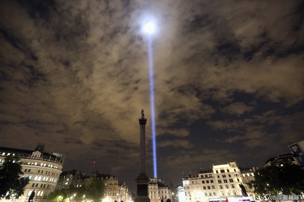 路透社照片是紀念英國加入一次大戰100周年的活動之一,這件取名為「光束」(Spectra)的裝置藝術作品,是由日本視覺藝術家池田亮司(Ryoji Ikeda)所設計,在熄燈之時點亮倫敦,吸引大批群眾觀賞。