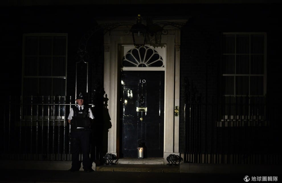 唐寧街10號也加入了熄燈的紀念儀式,在門口放置了點燃的蠟燭紀念英國參戰100年。照片中的警察站在燭光前守夜。
