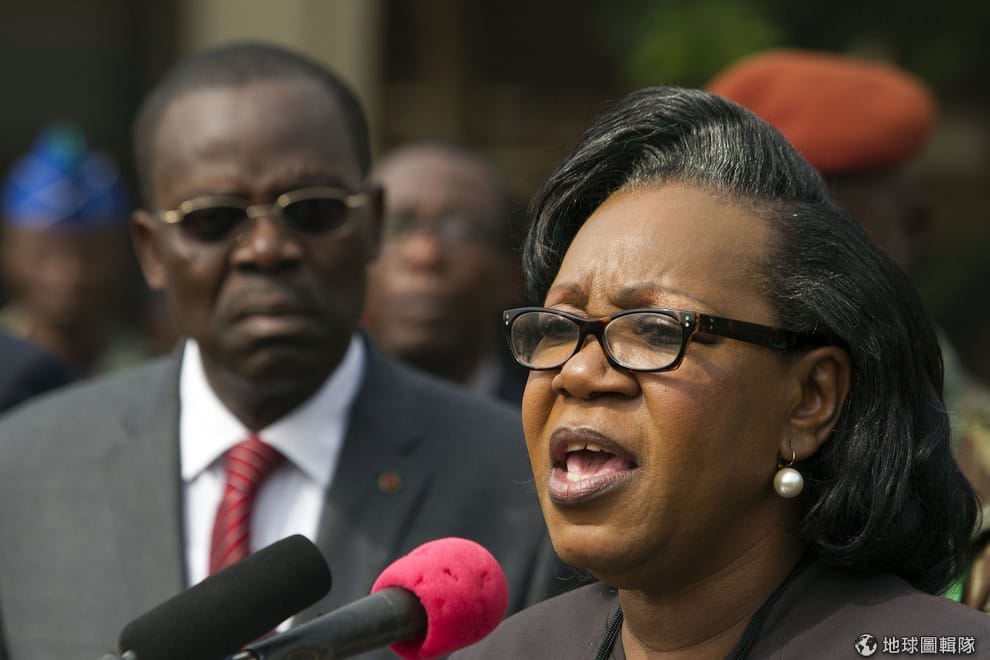中非共和國臨時總統桑巴潘札(右,Samba-Panza)發表演講,左手邊戴墨鏡的男人是下台的臨時總理恩札帕耶凱(Andre Nzapayeke)。