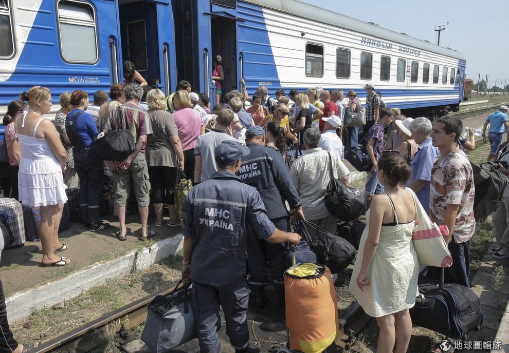 盧甘斯克地區的難民排隊等著要搭上火車。