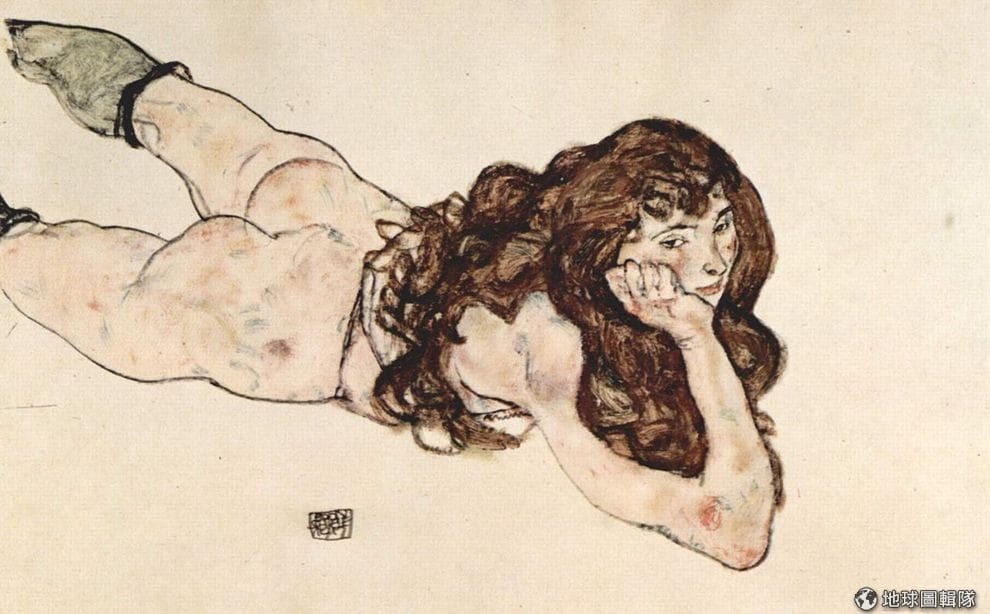 《裸體的女人》(德語:Sitzender weiblicher Akt mit aufgestützen Ellbogen),創作於1914,目前藏於維也納的阿爾貝蒂娜博物館(Albertina)。photo credit: 維基百科