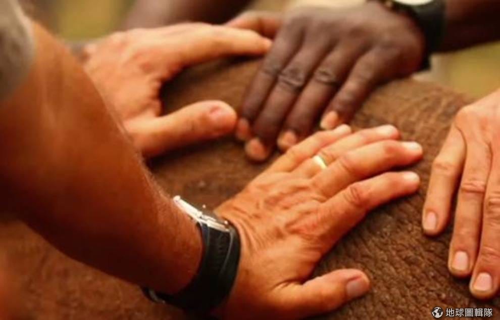 和盜獵者的手不同,這些工作人員們將手搭在犀牛身上是為了讓牠們到安全的家園生活。 影片截圖