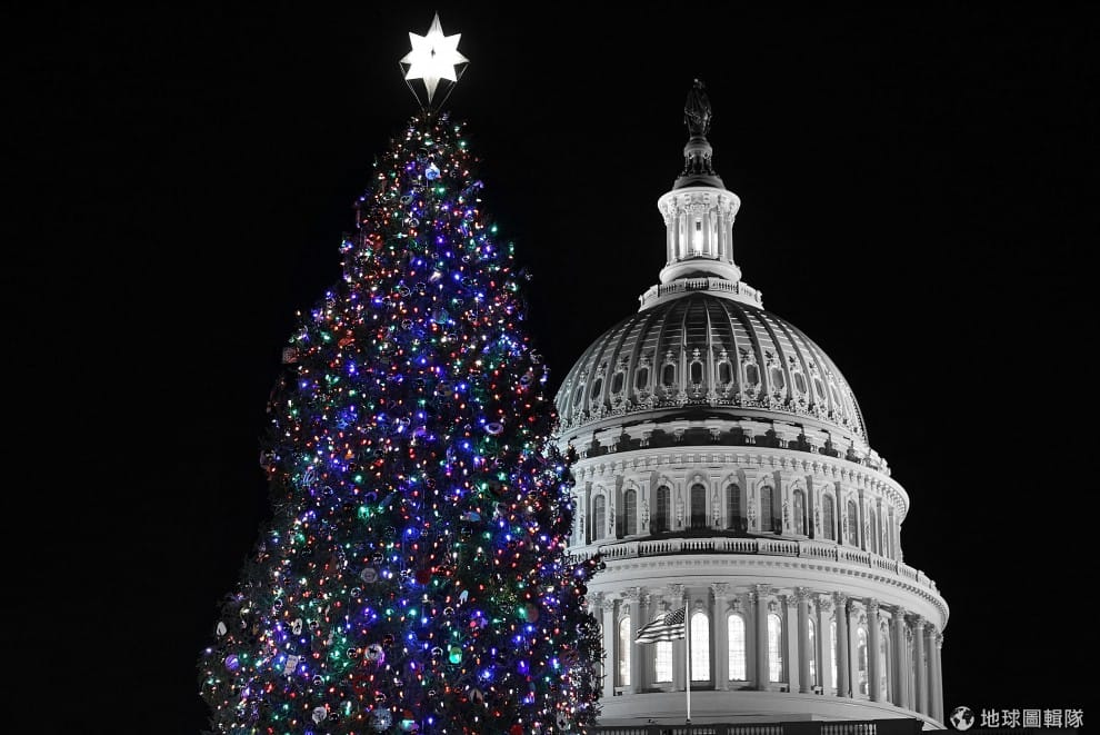 美國每年都會選出放在首都華府的聖誕樹,今年的聖誕樹高達20公尺!最上方的星星好搶眼,與後方的華盛頓議會互相輝映,非常美的景象!圖片來源: Alex Wong/Getty Images