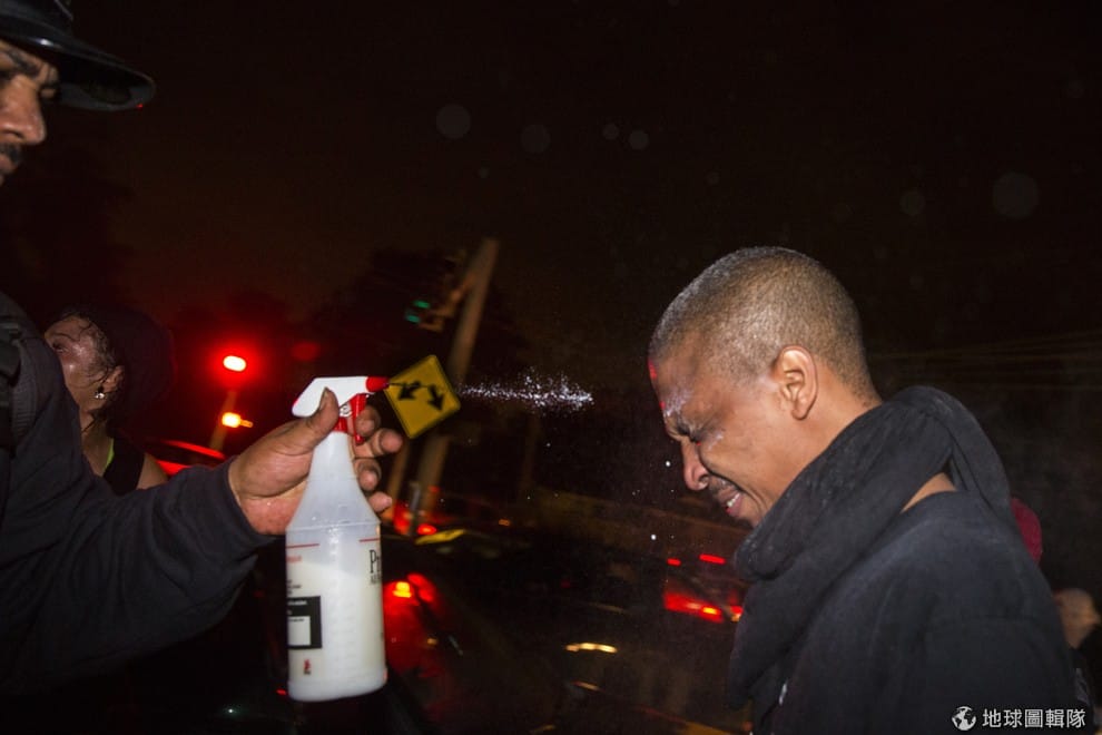 一名示威者被催淚瓦斯燻到睜不開眼,旁人用制酸劑幫他減輕痛苦。
