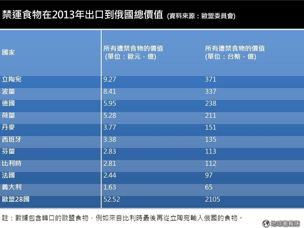 2013年時,歐盟國家裡出口最多食物到俄國的國家是波蘭和立陶宛。