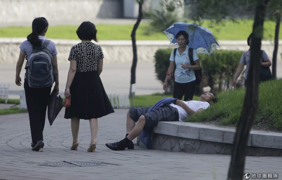 平壤市區內的公園,穿著及膝裙和有跟涼鞋的女性走過。
