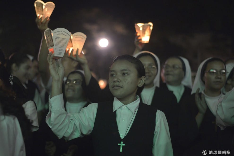 照片中一名修女拿著蠟燭,參加紀念羅梅羅大主教的遊行。