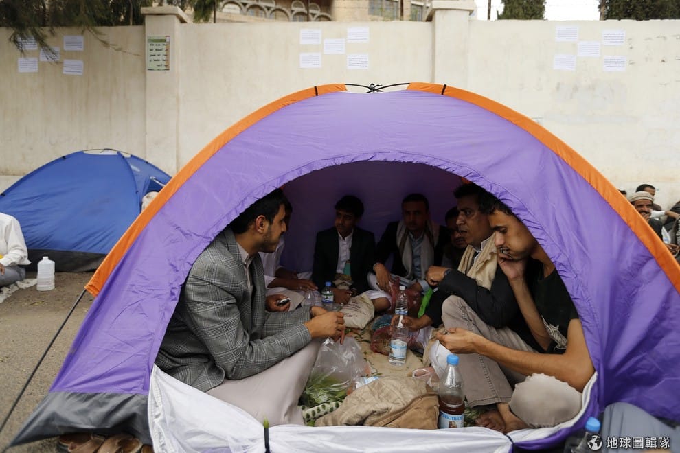 示威活動中,坐在臨時帳棚裡的胡西組織成員。