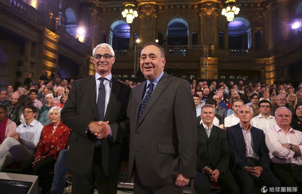 週一(25日)晚間,反對蘇格蘭獨立陣營「Happy Together」的領導人達林(圖左)和獨派陣營「Yes Scotland」的薩蒙德(圖右)進行最後的選前電視辯論。