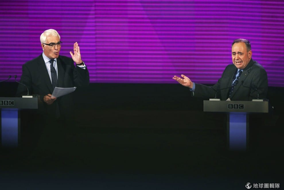 《德國之聲》25日報導,週一晚間英國上演了一場充滿爭論和叫囂的電視激辯,獨派的蘇格蘭首席部長薩蒙德(Alex Salmond)和支持聯合的英國前財政大臣達林(Alistair Darling) 進行最後的電視轉播論戰,雙方皆在充足的備戰下,向全英國人民展開了激烈的蘇格蘭公投辯論。