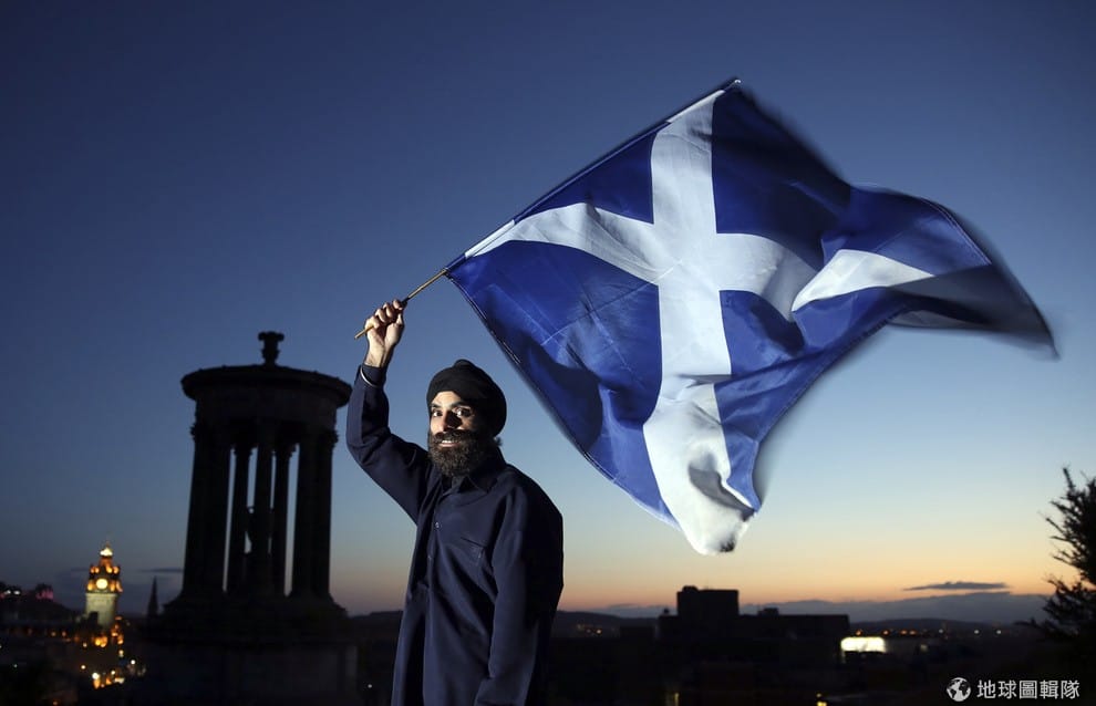 照片中是名在愛丁堡揮旗支持蘇格蘭獨立的印度移民,他在2001年移民蘇格蘭並活躍於獨派的「Yes Scotland」陣營。