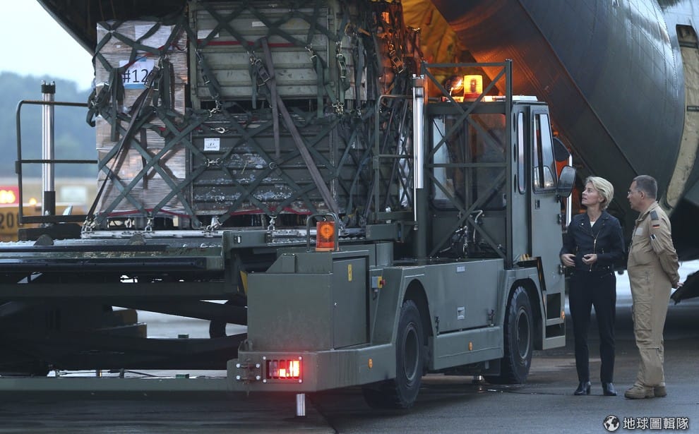 15號的時候,德國國防部長馮德萊恩(Ursula von der Leyen,左)和軍人站在一起講話,一旁德國要送到伊拉克的人道物資正準備要裝到飛機上。