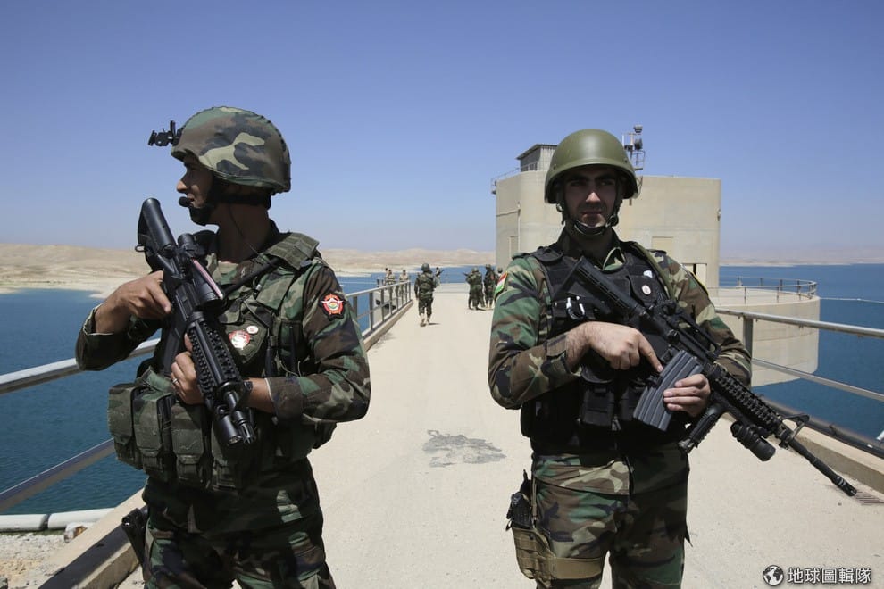 庫德族士兵在伊拉克的摩蘇爾水壩站崗。