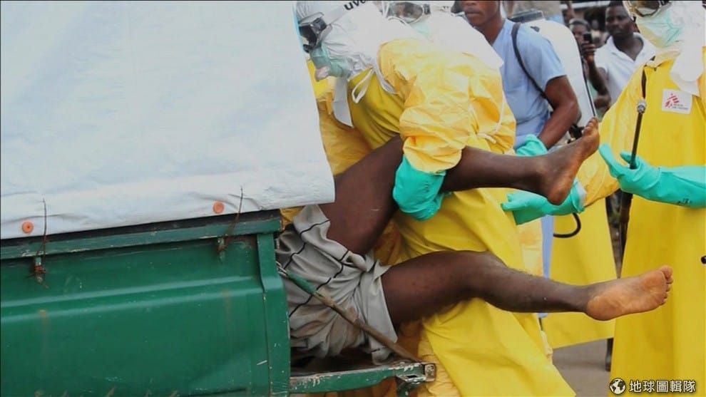 照片中一名無國界醫生正指揮醫療人員防止伊波拉病患私自逃出隔離區。